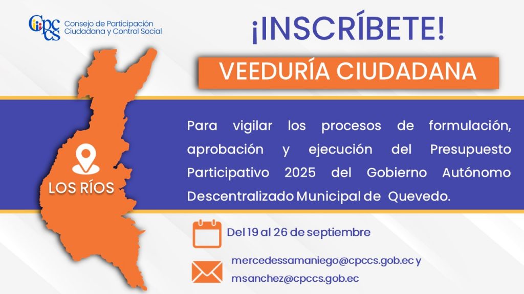 Quito, 19 de septiembre de 2025 Boletín de Prensa Nro. 1052 Se conforma una Veeduría para vigilar la formulación del Presupuesto Participativo 2025 en Quevedo El Consejo de Participación Ciudadana y Control Social (CPCCS) invita a la ciudadanía a inscribirse en la Veeduría para vigilar los procesos de formulación, aprobación y ejecución del Presupuesto Participativo [...]