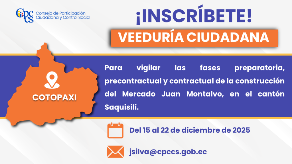Quito, 10 de diciembre de 2025 Boletín de Prensa Nro. 1136 Veeduría Ciudadana para vigilar y controlar el cumplimiento en materia ambiental y social del Centro de Faenamiento del trópico húmedo en la ciudad de Santo Domingo El Consejo de Participación Ciudadana y Control Social (CPCCS) invita a la ciudadanía a inscribirse en la Veeduría […]