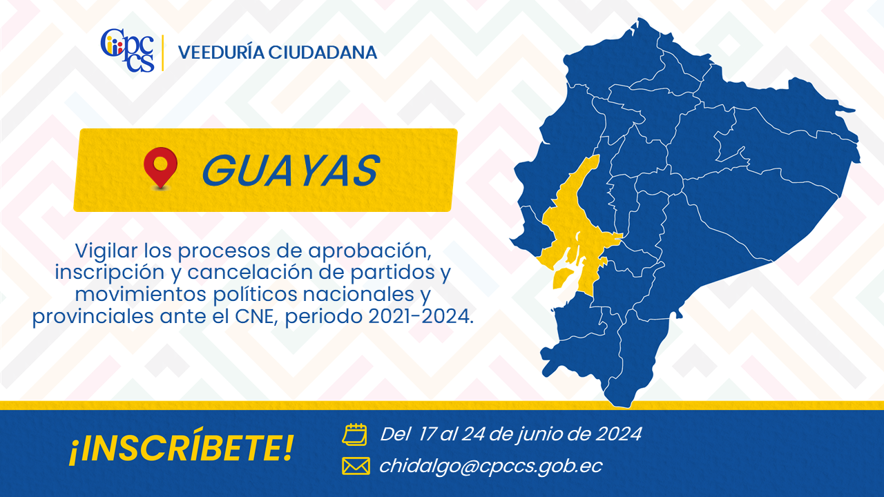 El Consejo de Participación Ciudadana y Control Social (CPCCS) invita a la ciudadanía a inscribirse en la Veeduría para vigilar los procesos de aprobación, inscripción y cancelación de los partidos y movimientos políticos nacionales y provinciales, ante el Consejo Nacional Electoral, desde mayo de 2021 a mayo de 2024.