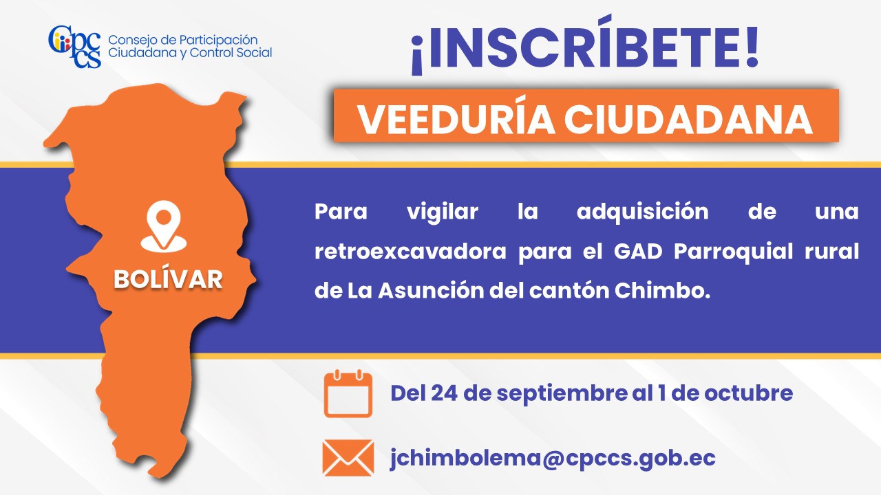 El Consejo de Participación Ciudadana y Control Social (CPCCS) invita a la ciudadanía, de forma individual o colectiva, a inscribirse en la tercera convocatoria a veeduría para vigilar la adquisición de una retroexcavadora para el Gobierno Autónomo Descentralizado Parroquial Rural de La Asunción, del cantón Chimbo, provincia Bolívar.