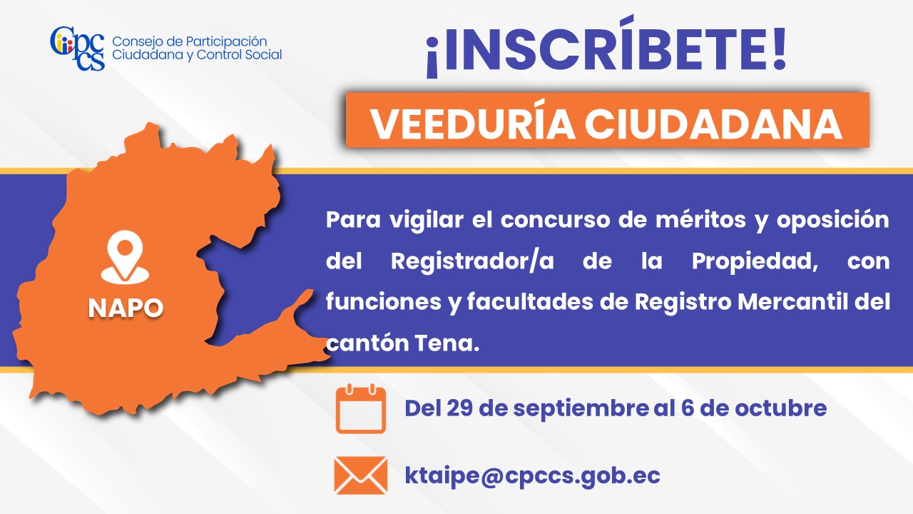 El Consejo de Participación Ciudadana y Control Social (CPCCS) invita a la ciudadanía, de forma individual o colectiva, a inscribirse en la veeduría para vigilar el concurso de méritos y oposición, para la selección del Registrador/a de la Propiedad, con funciones y facultades de Registro Mercantil del cantón Tena, provincia de Napo