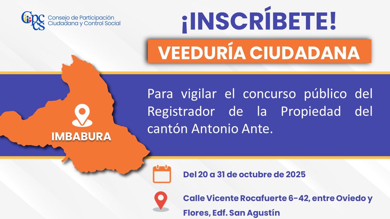 El Consejo de Participación Ciudadana y Control Social (CPCCS) invita a la ciudadanía a inscribirse en la veeduría ciudadana para dar seguimiento al concurso del Registrador de la Propiedad del cantón Antonio Ante, provincia de Imbabura.