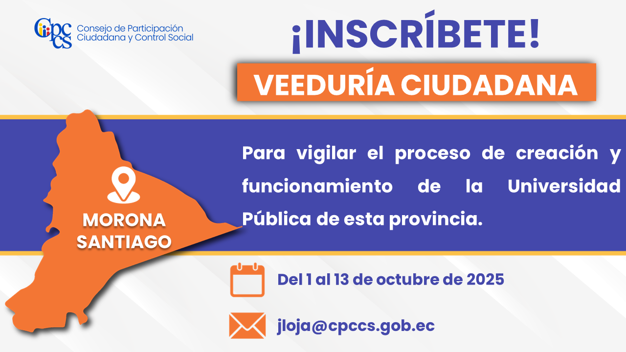 El Consejo de Participación Ciudadana y Control Social (CPCCS) invita a la ciudadanía a inscribirse en la Veeduría para vigilar el proceso de creación y funcionamiento de la Universidad Pública de la provincia de Morona Santiago.
