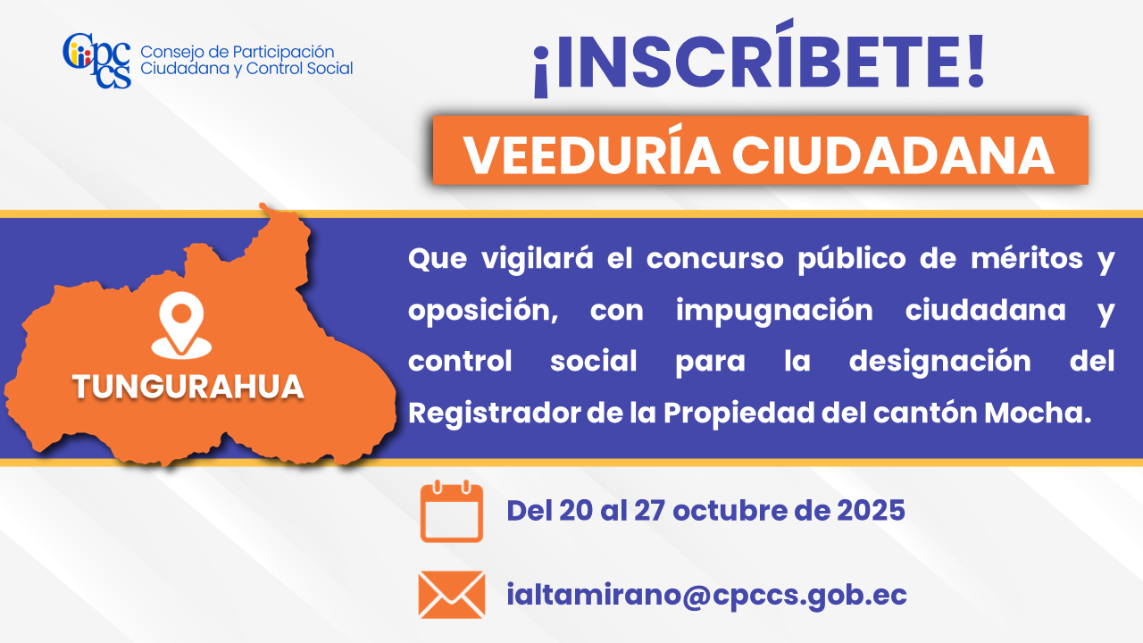 El Consejo de Participación Ciudadana y Control Social (CPCCS) invita a la ciudadanía a inscribirse en la Veeduría para vigilar el concurso público de méritos y oposición para la designación del Registrador de la Propiedad del cantón Mocha, en la provincia de Tungurahua.