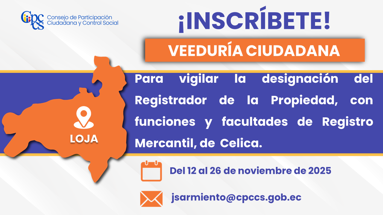 El Consejo de Participación Ciudadana y Control Social (CPCCS) invita a la ciudadanía a inscribirse en la Veeduría para vigilar el concurso público de méritos y oposición, impugnación ciudadana y control social para la designación del Registrador de la Propiedad, con funciones y facultades de Registro Mercantil, del cantón Celica en la provincia de Loja.