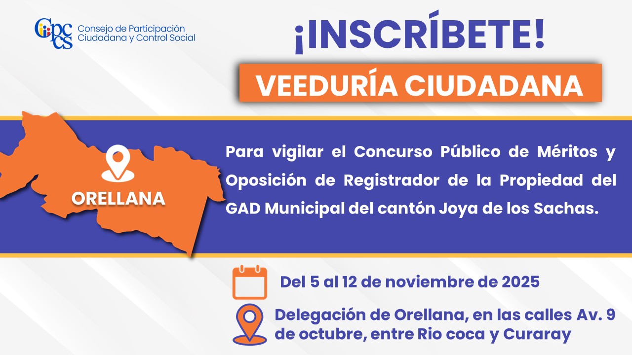 El Consejo de Participación Ciudadana y Control Social (CPCCS) invita a la ciudadanía a inscribirse en la Veeduría para vigilar el proceso del Concurso Público de Méritos y Oposición, Impugnación Ciudadana y Control Social para la selección y designación de Registrador de la Propiedad con funciones y facultades de Registro Mercantil del Gobierno Autónomo Descentralizado Municipal del cantón Joya de los Sachas, de la provincia de Orellana.