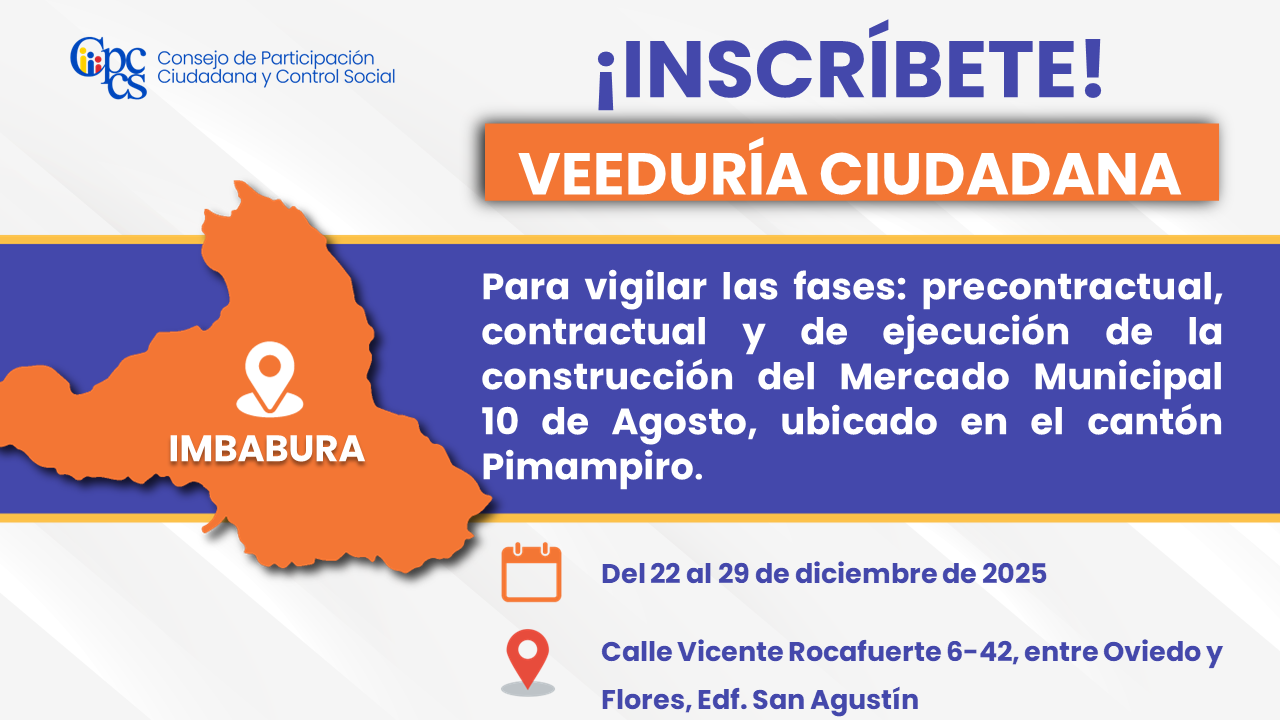 El Consejo de Participación Ciudadana y Control Social (CPCCS) invita a la ciudadanía a inscribirse en la Veeduría para vigilar las fases: precontractual, contractual y de ejecución de la construcción del Mercado Municipal 10 de Agosto, ubicado en el cantón Pimampiro, en la provincia de Imbabura.