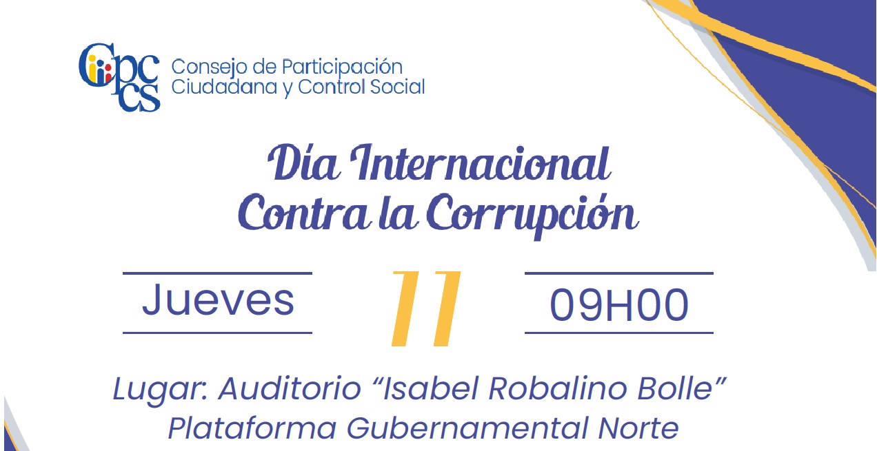En el marco del Día Internacional contra la Corrupción, el Consejo de Participación Ciudadana y Control Social (CPCCS) invita a la ciudadanía a un encuentro de reflexión y análisis sobre este fenómeno social, abordado desde perspectivas académicas e institucionales. La jornada, de acceso libre, se desarrollará el jueves 11 de diciembre de 2025, en la Plataforma Gubernamental Norte (Amazonas y Alfonso Pereira, Auditorio Isabel Robalino), a partir de las 09:00.