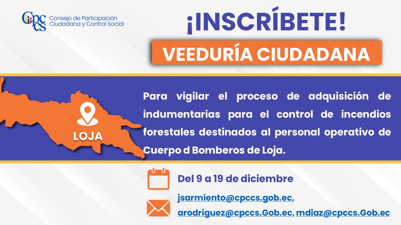 El Consejo de Participación Ciudadana y Control Social (CPCCS) invita a la ciudadanía a inscribirse en la veeduría para vigilar el proceso de adquisición de trajes y prendas para el control de incendios forestales destinado al personal operativo del Cuerpo de Bomberos de Loja.