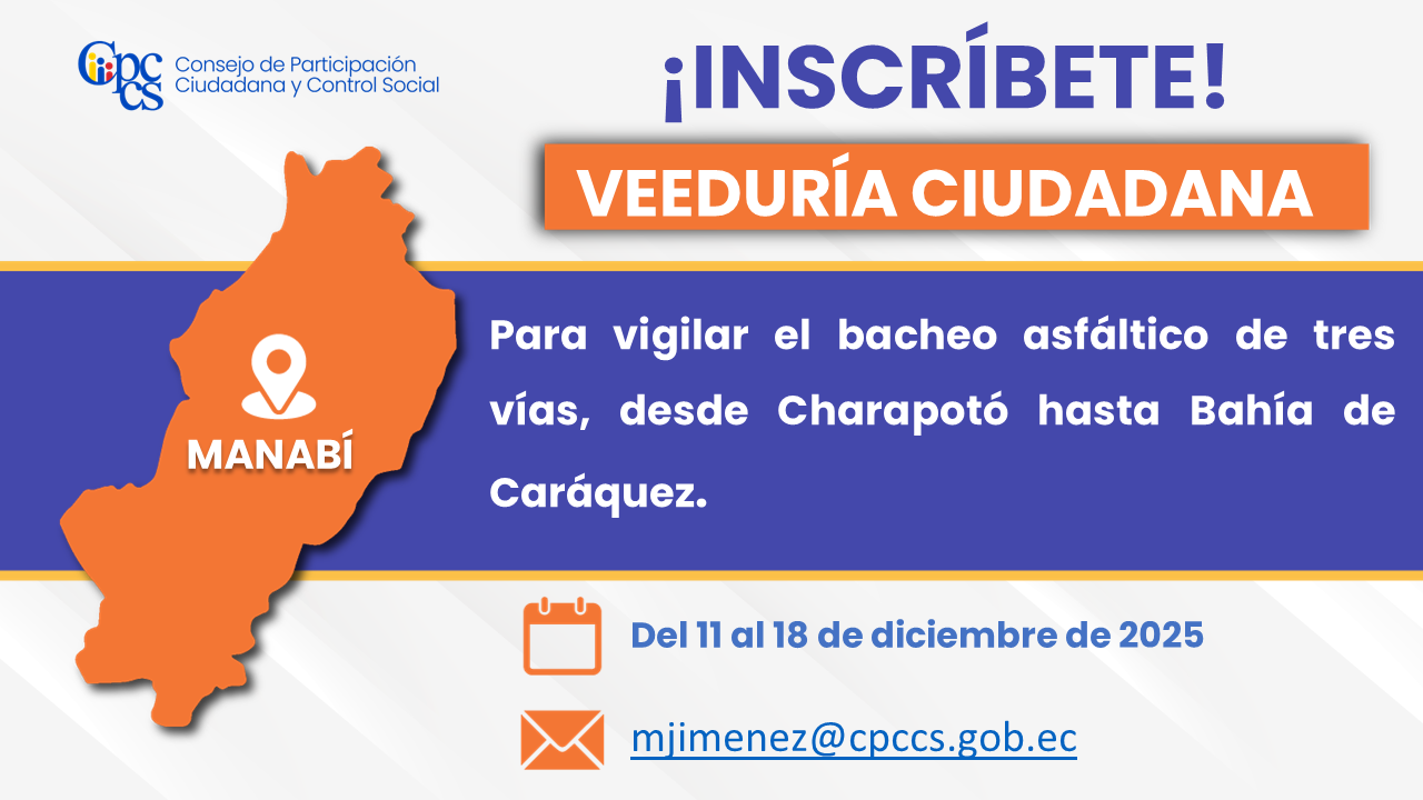 El Consejo de Participación Ciudadana y Control Social (CPCCS) invita a la ciudadanía a inscribirse en la Veeduría para vigilar el bacheo asfáltico de tres vías, desde Charapotó hasta Bahía de Caráquez, en la provincia de Manabí.