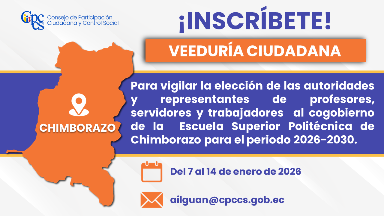 El Consejo de Participación Ciudadana y Control Social (CPCCS) invita a la ciudadanía a inscribirse en la Veeduría para vigilar la elección de las autoridades y representantes de los profesores, estudiantes, servidores y trabajadores al cogobierno de la Escuela Superior Politécnica de Chimborazo para el periodo 2026-2030.