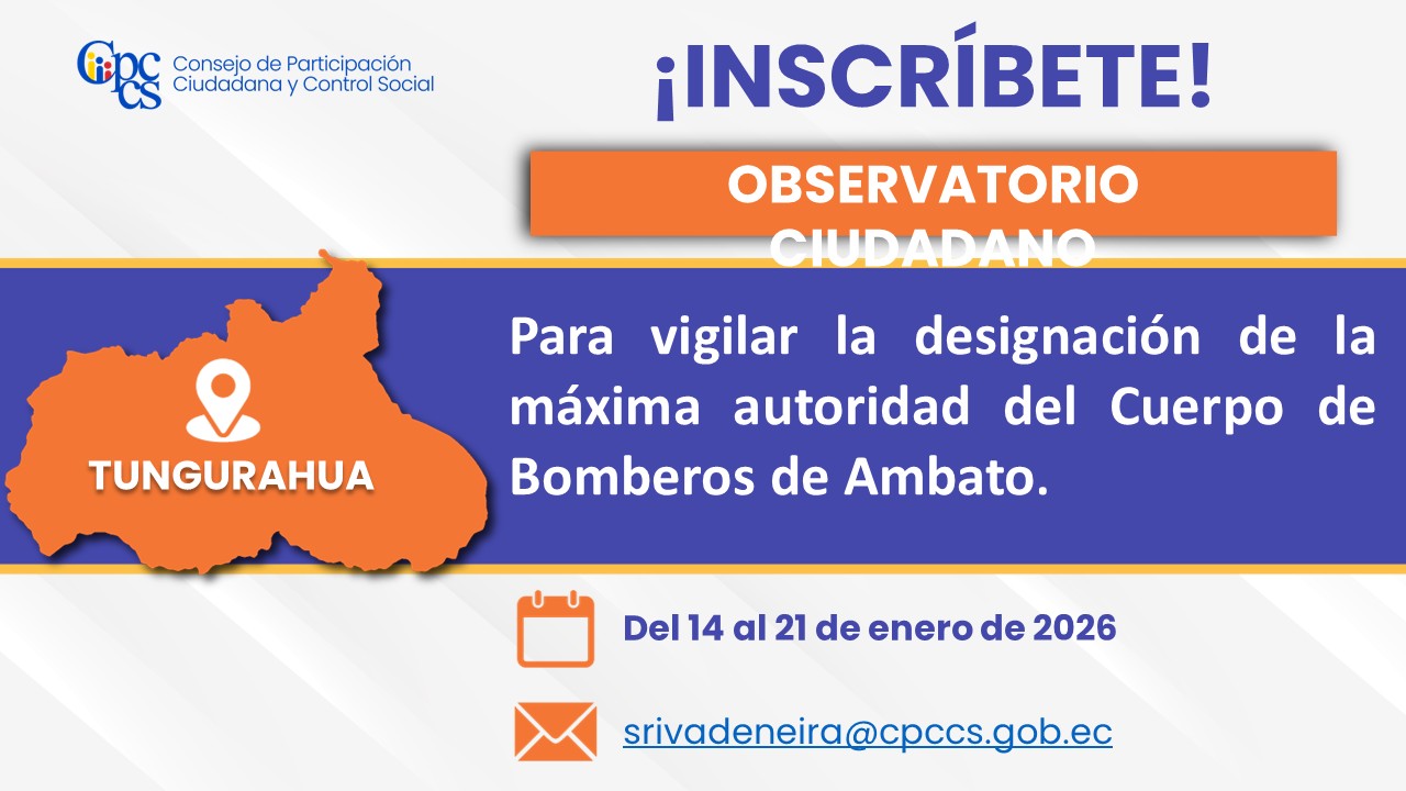 Las inscripciones se receptarán en la delegación provincial de Tungurahua, en la ciudad de Ambato, ubicada en las calles México 11–03 y Chile, o al correo electrónico: srivadeneira@cpccs.gob.ec, del 14 a 21 de enero de 2026.