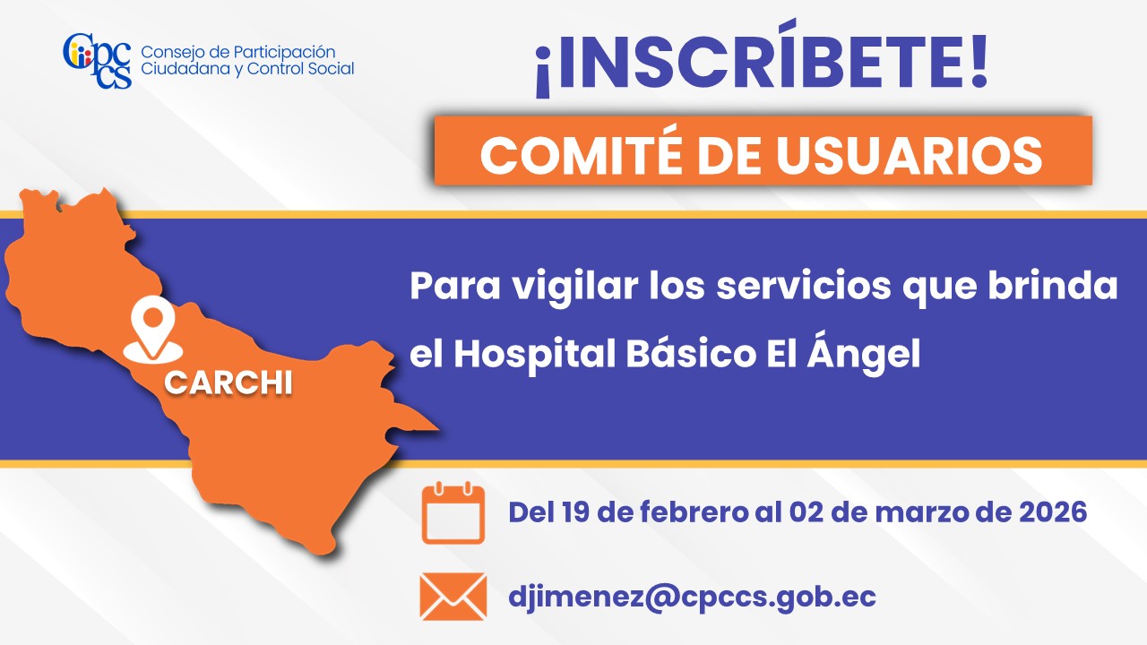 El Consejo de Participación Ciudadana y Control Social (CPCCS) convoca a la ciudadanía a ser parte de laConvocatoria a integrar Comité de Usuarios de servicio público para vigilar los servicios que brinda el Hospital Básico El Ángel.