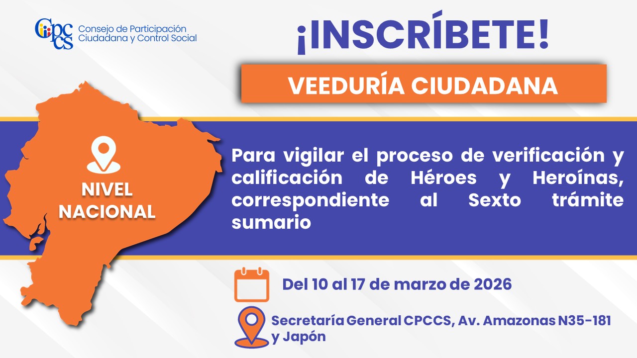 El Consejo de Participación Ciudadana y Control Social (CPCCS) invita a la ciudadanía a inscribirse en la Veeduría para vigilar el proceso de verificación y calificación de Héroes y Heroínas nacionales, correspondiente al Sexto trámite sumario