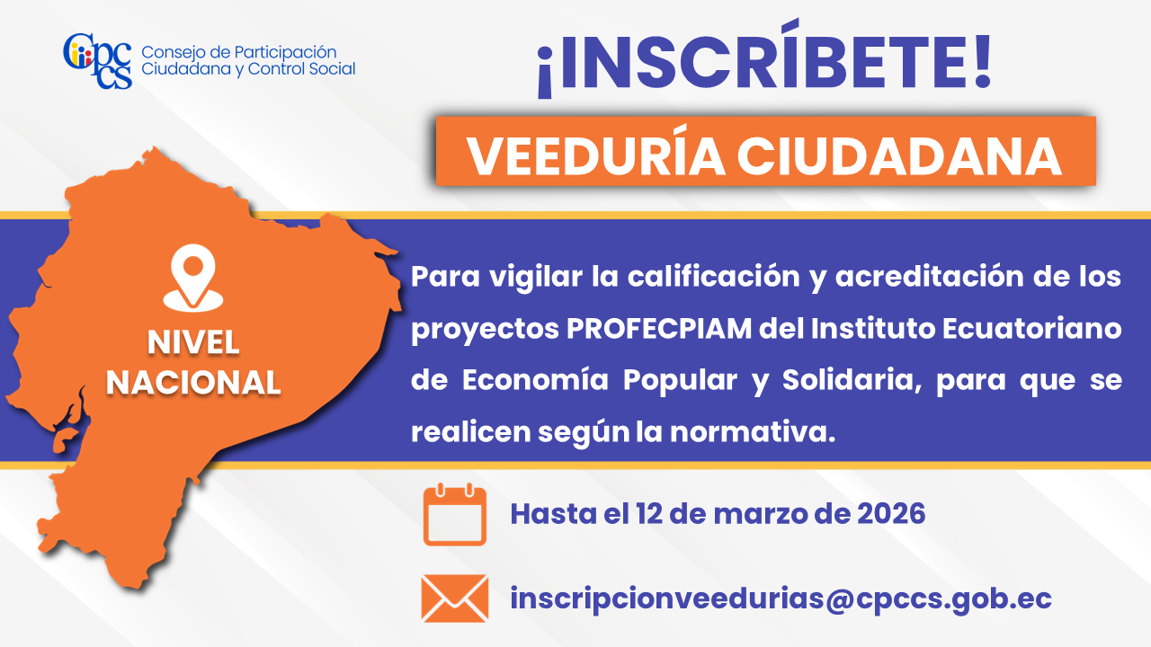 El Consejo de Participación Ciudadana y Control Social (CPCCS) invita a la ciudadanía a inscribirse en la Veeduría para vigilar el proceso de calificación y acreditación de los proyectos PROFECPIAM del Instituto Ecuatoriano de Economía Popular y Solidaria.
