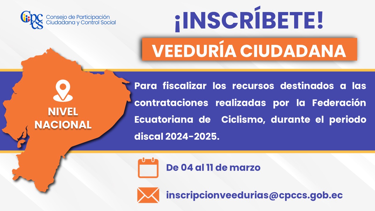 El Consejo de Participación Ciudadana y Control Social (CPCCS) invita a la ciudadanía a inscribirse en la Veeduría Ciudadana para vigilar y fiscalizar los recursos destinados a las contrataciones realizadas por la Federación Ecuatoriana de Ciclismo, durante el periodo fiscal 2024-2025.