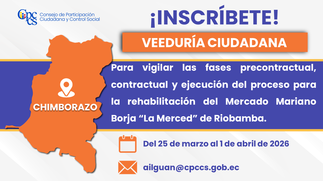 El Consejo de Participación Ciudadana y Control Social (CPCCS) invita a la ciudadanía a inscribirse en la Veeduría para vigilar las fases: precontractual, contractual y de ejecución del proceso para la rehabilitación y reestructuración del Mercado Mariano Borja “La Merced”, del cantón Riobamba, en la provincia de Chimborazo.