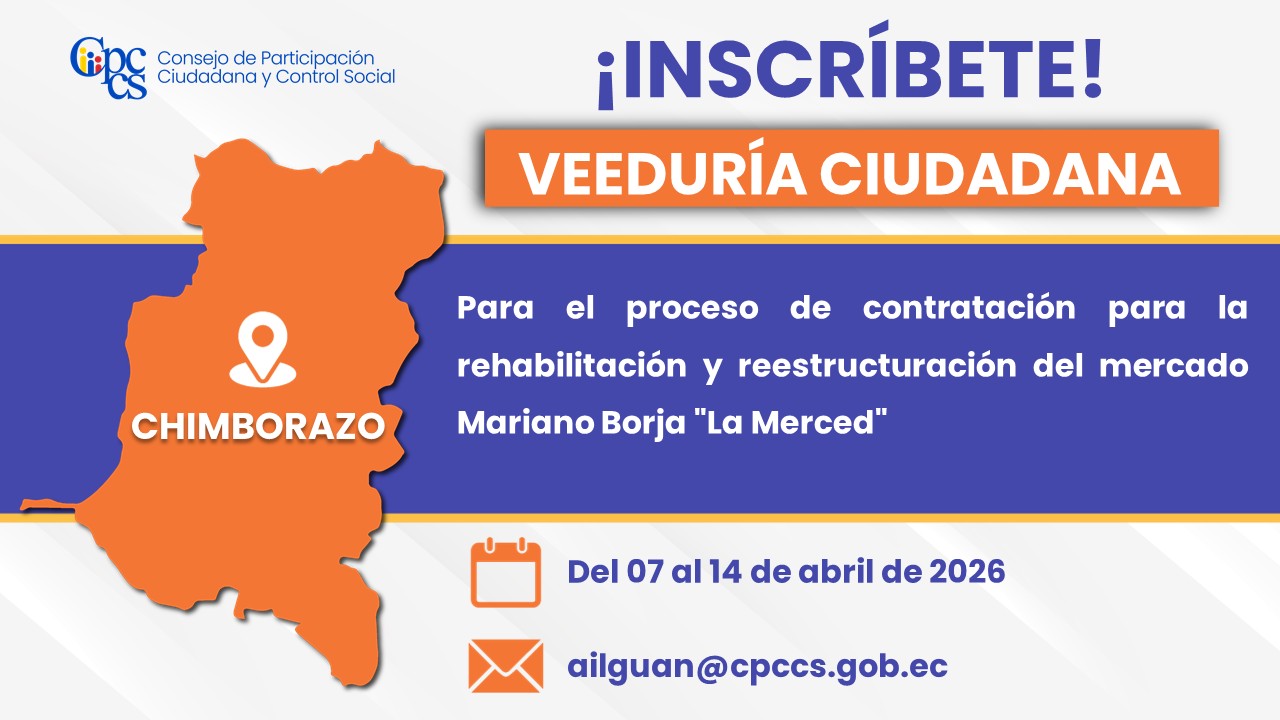 El Consejo de Participación Ciudadana y Control Social (CPCCS) invita a la ciudadanía a inscribirse en la Veeduría Ciudadana para vigilar la fase precontractual, contractual y ejecución del proceso de contratación signado con el código N° LICO-GADMR-2025-008, para la rehabilitación y reestructuración del mercado Mariano Borja “La Merced” del cantón Riobamba provincia de Chimborazo.