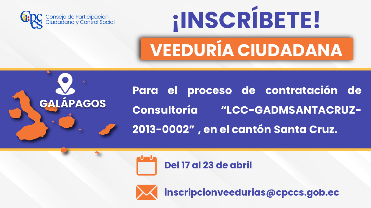 El Consejo de Participación Ciudadana y Control Social (CPCCS) invita a inscribirse en la Veeduría Ciudadana cuyo objetivo es vigilar el proceso de contratación de consultoría: “LCC-GADMSANTACRUZ -2023-00002”, en el cantón Santa Cruz, provincia de Galápagos.