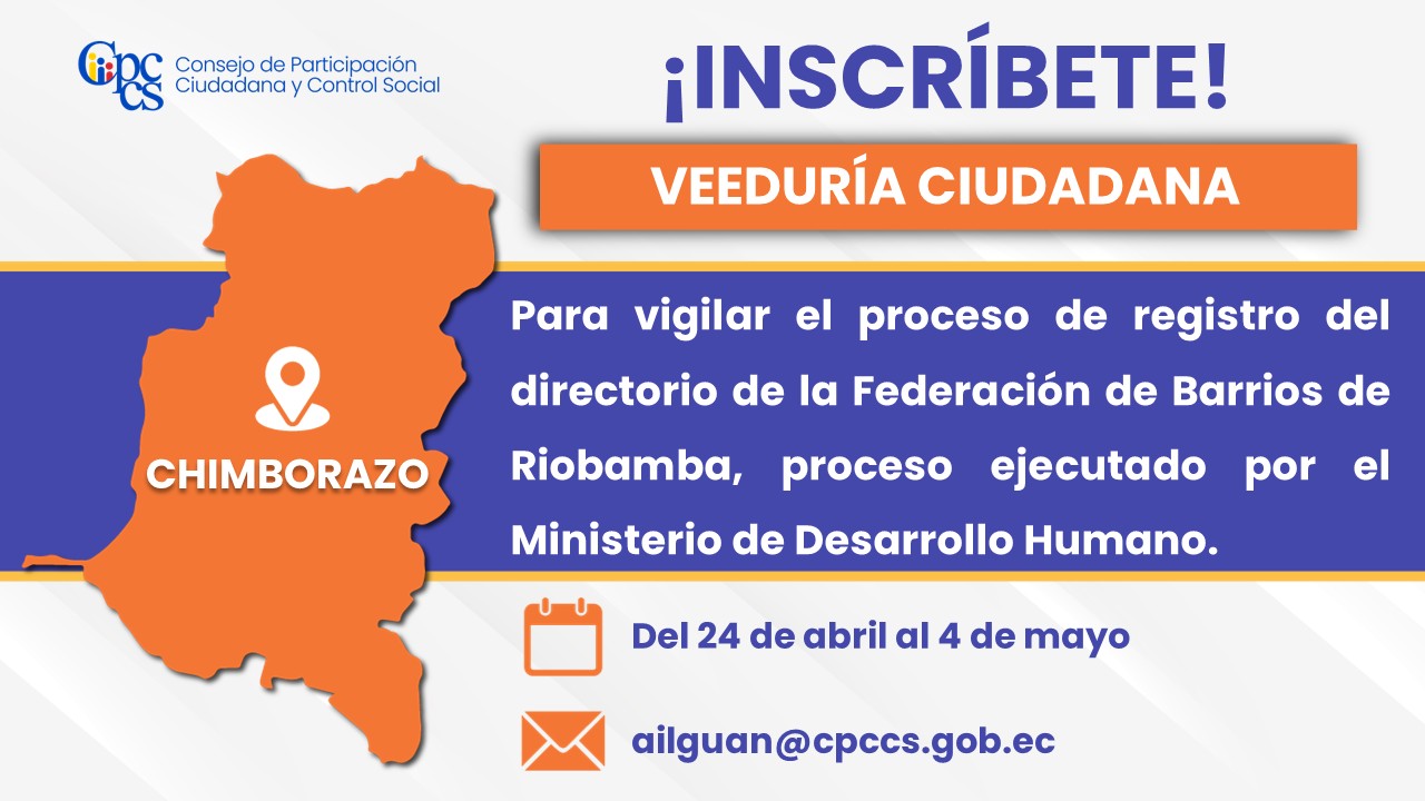 El Consejo de Participación Ciudadana y Control Social (CPCCS) invita a la ciudadanía a inscribirse en la Veeduría Ciudadana para vigilar el proceso de registro del directorio de la Federación de Barrios de Riobamba (FEDEBAR) para el período 2026 – 2028, proceso ejecutado por el Ministerio de Desarrollo Humano (MDH).