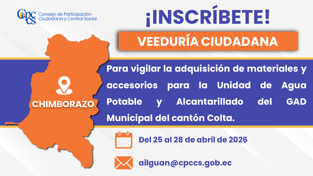 El Consejo de Participación Ciudadana y Control Social (CPCCS) invita a la ciudadanía a inscribirse en la Veeduría para vigilar la adquisición de materiales y accesorios para la Unidad de Agua Potable y Alcantarillado del Gobierno Autónomo Descentralizado Municipal del Catón Colta, en la provincia de Chimborazo.