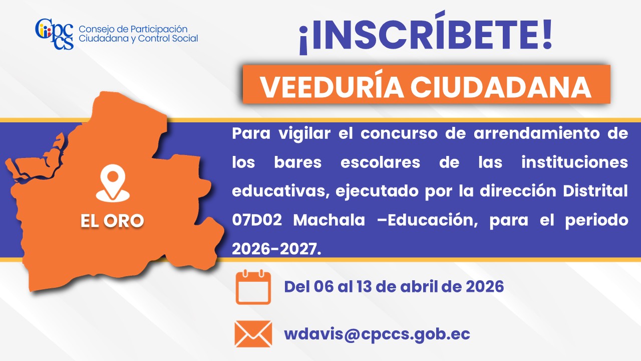 El Consejo de Participación Ciudadana y Control Social (CPCCS) invita a la ciudadanía a inscribirse en la Veeduría Ciudadana que tiene como objetivo dar seguimiento al concurso de arrendamiento de los bares escolares de las instituciones educativas, proceso ejecutado por la dirección Distrital 07D02 Machala – Educación, para el periodo 2026-2027.