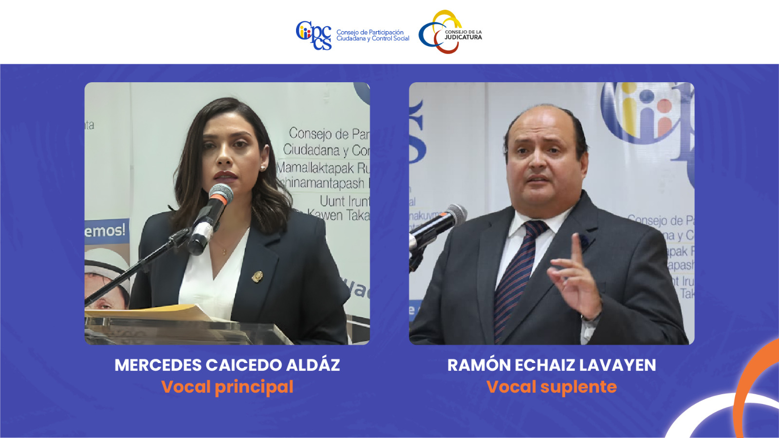 El Pleno del Consejo de Participación Ciudadana y Control Social (CPCCS) designó a Mercedes Caicedo Aldaz como vocal principal del Consejo de la Judicatura y a Ramón Echaiz Lavayen como su suplente, durante la Sesión Extraordinaria Nro. 15, realizada este 24 de abril de 2026.