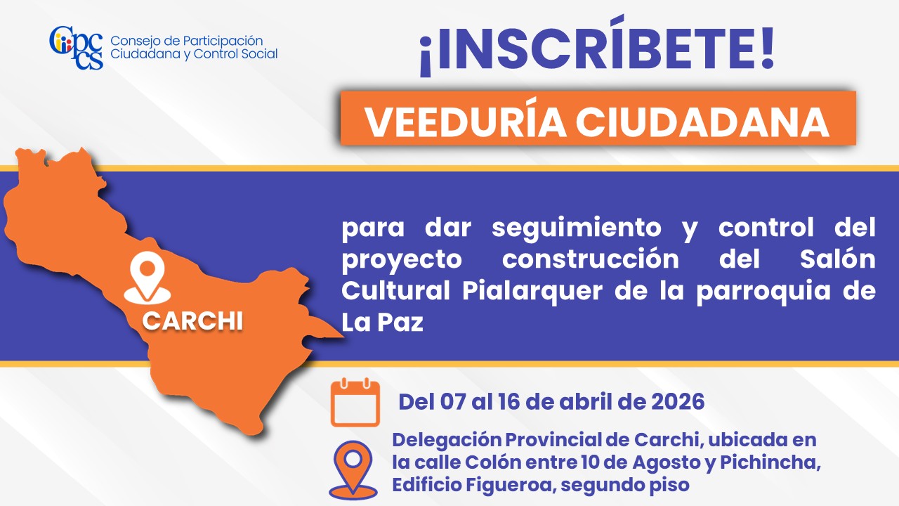 El Consejo de Participación Ciudadana y Control Social (CPCCS) invita a la ciudadanía a inscribirse en la Veeduría Ciudadana para dar seguimiento y control del proyecto construcción del Salón Cultural Pialarquer de la parroquia de La Paz.