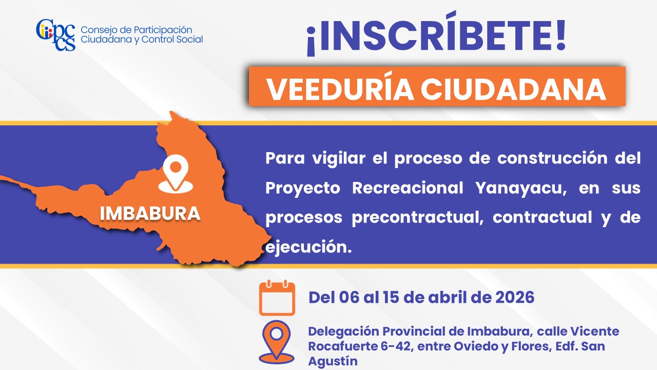 El Consejo de Participación Ciudadana y Control Social (CPCCS) invita a la ciudadanía a inscribirse en la Veeduría Ciudadana para vigilar el proceso de construcción “Proyecto Recreacional Yanayacu” en sus procesos precontractual, contractual y de ejecución.