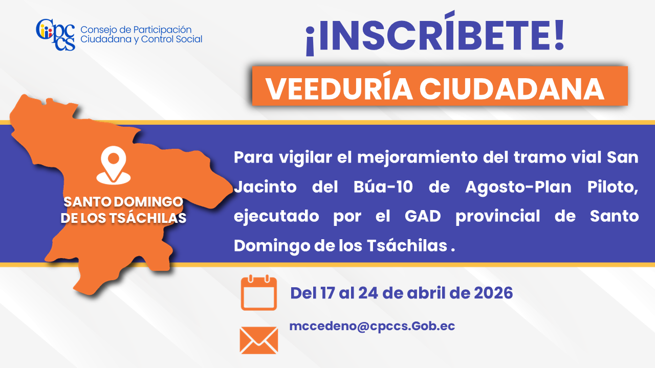 El Consejo de Participación Ciudadana y Control Social (CPCCS) invita a la ciudadanía a inscribirse en la Veeduría para verificar y vigilar el mejoramiento vial del tramo San Jacinto del Búa-10 de Agosto-Plan Piloto, ejecutado por el Gobierno Descentrado Provincial de Santo Domingo de los Tsáchilas.