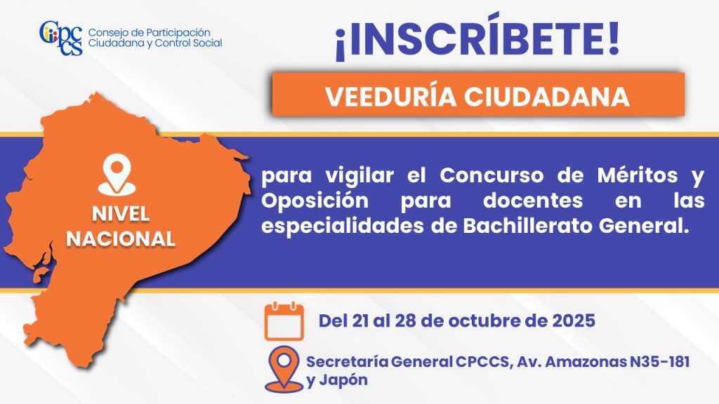 Quito, 20 de octubre de 2025 Boletín de Prensa Nro. 1088 Veeduría Ciudadana para vigilar el Concurso de Méritos y Oposición para docentes en las especialidades de Bachillerato General El Consejo de Participación Ciudadana y Control Social (CPCCS) invita a la ciudadanía a inscribirse en la Veeduría para vigilar cada una de las etapas del […]