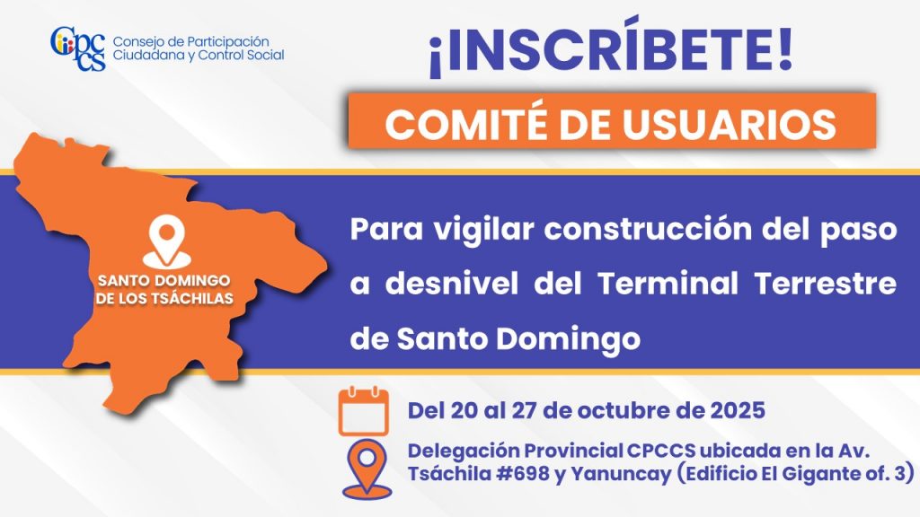 Quito, 20 de octubre de 2025 Boletín de Prensa Nro. 1087 Veeduría Ciudadana para vigilar construcción del paso a desnivel del Terminal Terrestre de Santo Domingo de los Tsáchilas El Consejo de Participación Ciudadana y Control Social (CPCCS) invita a la ciudadanía a inscribirse en la veeduría para vigilar la ejecución del Proyecto Construcción del […]