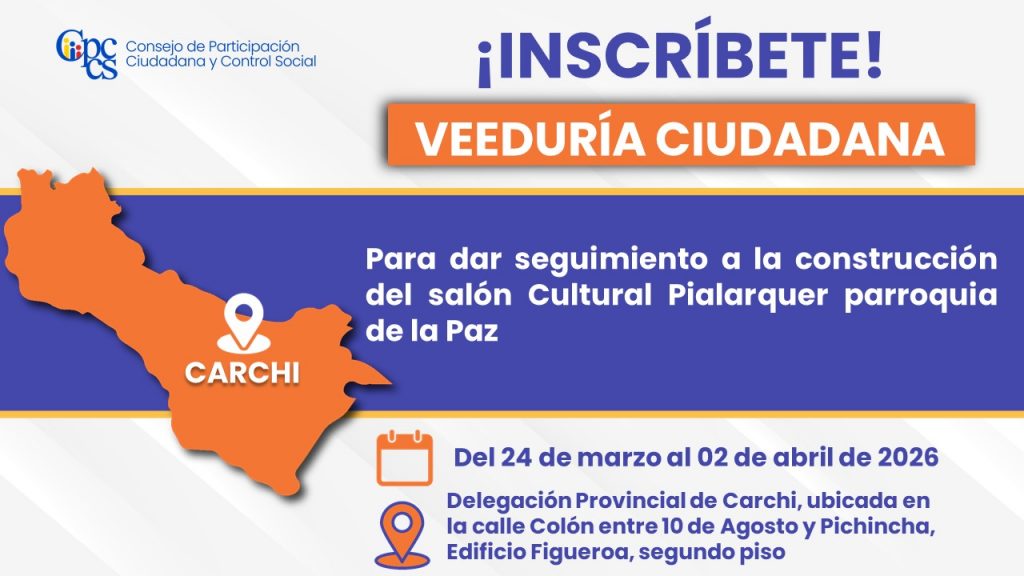Quito, 24 de marzo de 2026 Boletín de Prensa Nro. 1243 Veeduría Ciudadana para dar seguimiento a la construcción del salón Cultural Pialarquer parroquia de la Paz El Consejo de Participación Ciudadana y Control Social (CPCCS) invita a la ciudadanía a inscribirse en la Veeduría Ciudadana para dar seguimiento y control del Proyecto de Construcción […]