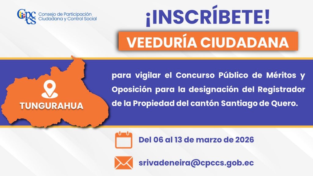Quito, 22 de diciembre de 2025 Boletín de Prensa Nro. 1150 Veeduría Ciudadana para vigilar la construcción de infraestructura pública, alcantarillado sanitario, equipamiento y optimización del tratamiento de aguas residuales El Consejo de Participación Ciudadana y Control Social (CPCCS) invita a la ciudadanía a inscribirse en la Veeduría Ciudadana para vigilar la construcción de infraestructura […]