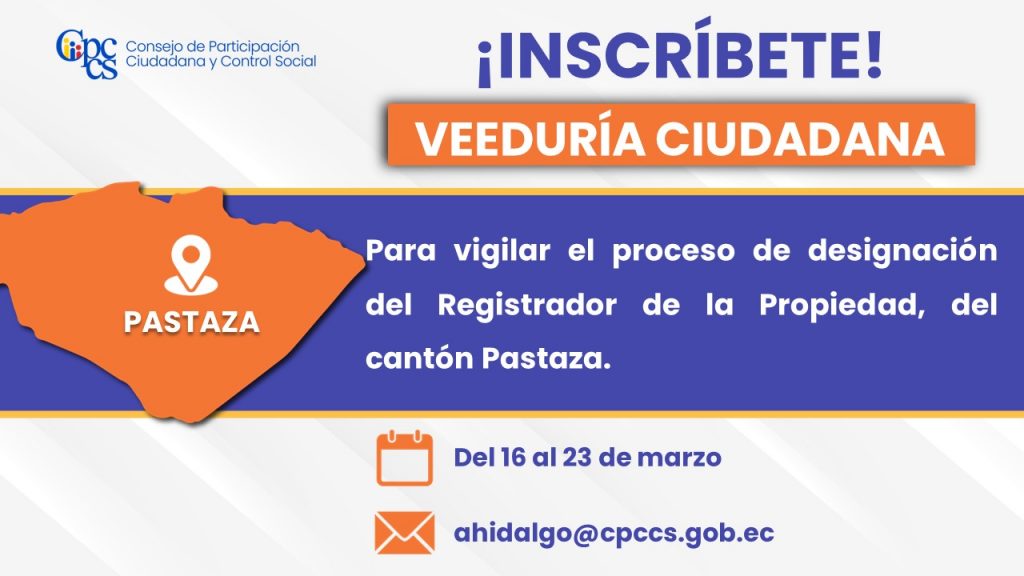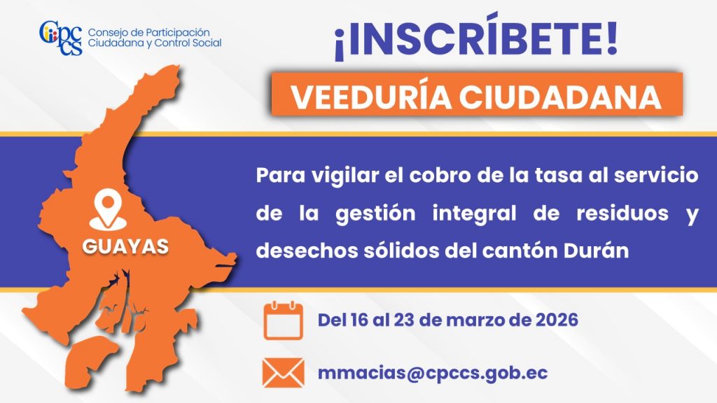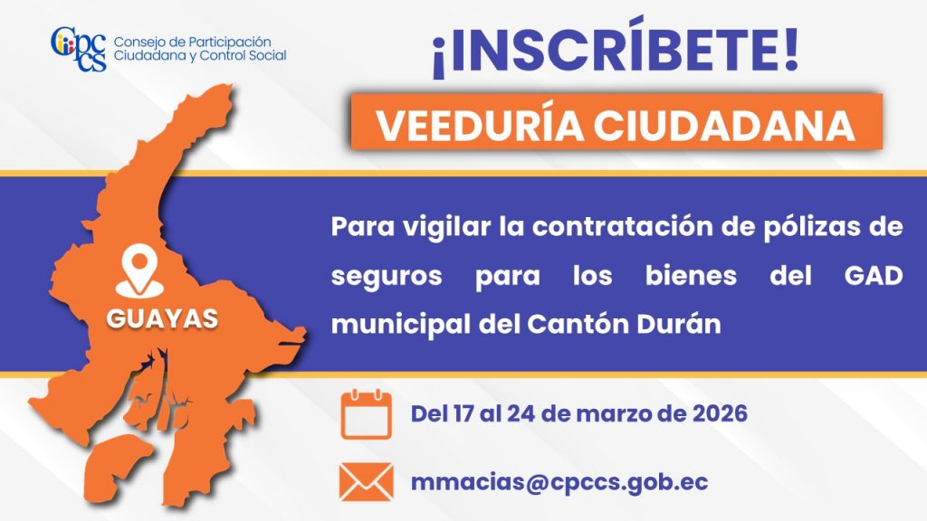 Quito, 16 de marzo de 2026 Boletín de Prensa Nro. 1238 Veeduría ciudadana para el control social, vigilancia y fiscalización de la contratación de pólizas de seguros para los bienes del GAD municipal del Cantón Durán El Consejo de Participación Ciudadana y Control Social (CPCCS) invita a la ciudadanía a inscribirse en la Veeduría […]