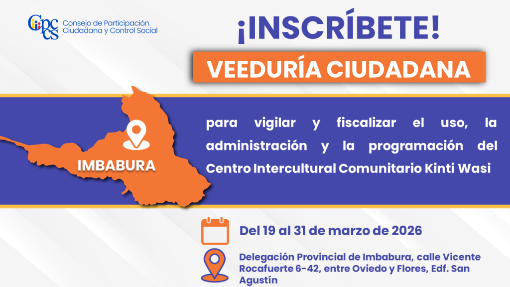Quito, 19 de marzo de 2026 Boletín de Prensa Nro. 1241 Veeduría ciudadana para vigilar y fiscalizar el uso, la administración y la programación del Centro Intercultural Comunitario Kinti Wasi El Consejo de Participación Ciudadana y Control Social (CPCCS) invita a la ciudadanía a inscribirse en la Veeduría ciudadana para vigilar y fiscalizar el […]