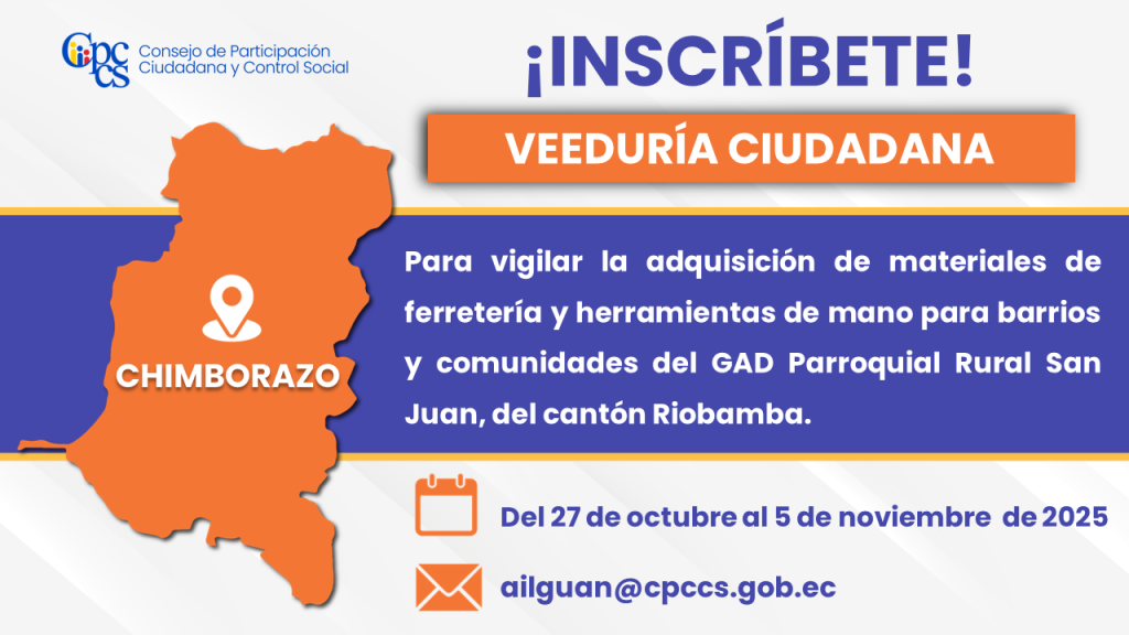 Quito, 27 de octubre de 2025 Boletín de Prensa Nro. 1095 Veeduría a la adquisición de materiales de ferretería y herramientas de mano para comunidades de Chimborazo El Consejo de Participación Ciudadana y Control Social (CPCCS) invita a la ciudadanía a inscribirse en la Veeduría para vigilar el proyecto de adquisición de materiales de ferretería [...]