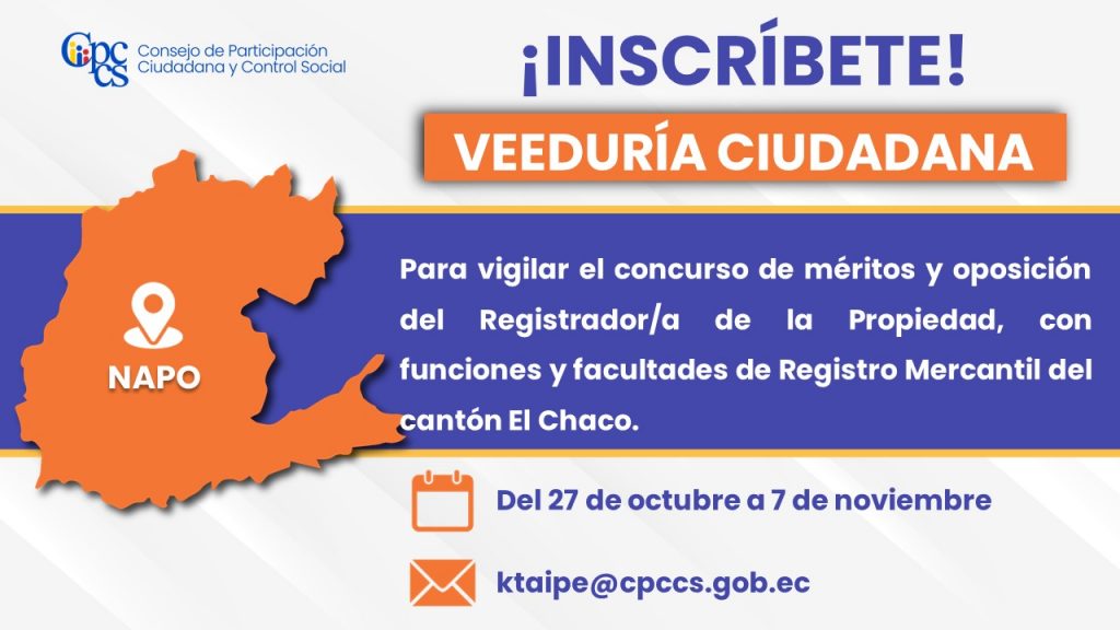 Quito, 27 de octubre de 2025 Boletín de Prensa Nro. 1094 Se conforma una Veeduría para vigilar la selección del Registrador de la Propiedad del cantón El Chaco El Consejo de Participación Ciudadana y Control Social (CPCCS) invita a la ciudadanía inscribirse en la veeduría para vigilar el concurso público de méritos y oposición, para [...]