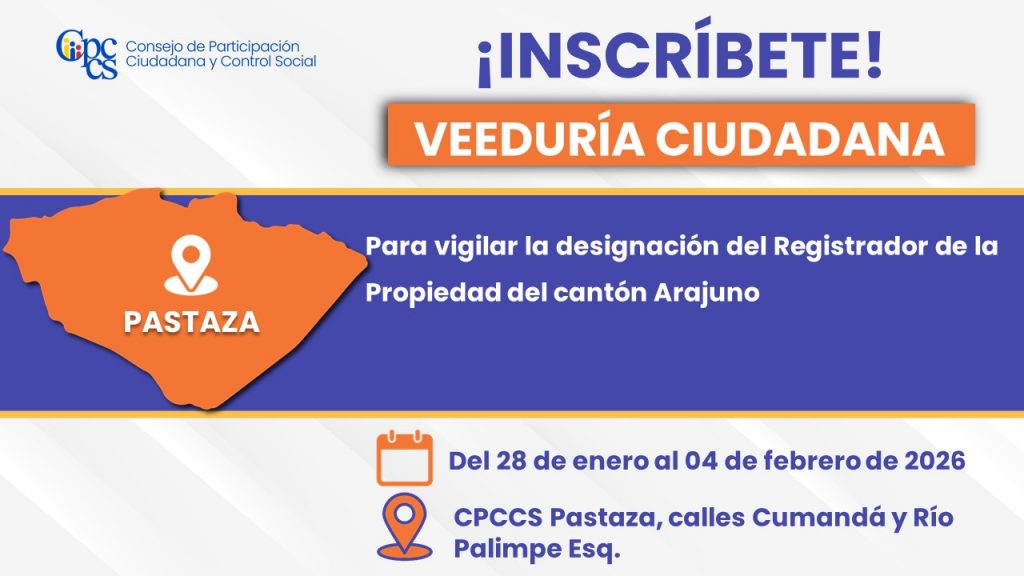 Quito, 04 de febrero de 2026 Boletín de Prensa Nro. 1191 Veeduría Ciudadana para vigilar el proceso de verificación y calificación de Héroes y Heroínas nacionales, correspondiente al Sexto Trámite sumario El Consejo de Participación Ciudadana y Control Social (CPCCS) invita a la ciudadanía a inscribirse en la Veeduría Ciudadana para para vigilar el proceso […]