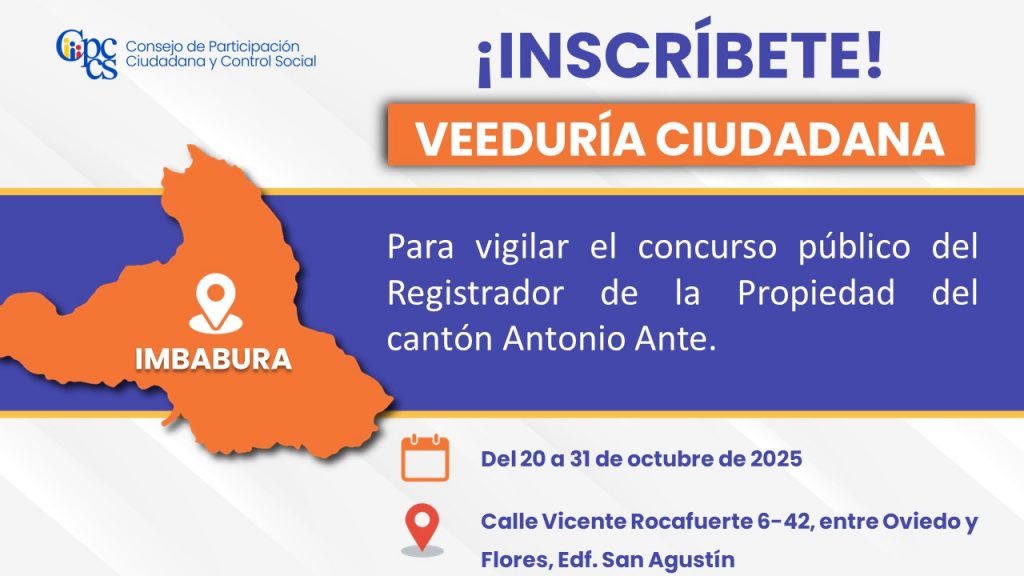 Quito, 17 de octubre de 2025 Boletín de Prensa Nro. 1084 Veeduría para vigilar la designación del Registrador de la Propiedad del cantón Mocha, en Tungurahua El Consejo de Participación Ciudadana y Control Social (CPCCS) invita a la ciudadanía a inscribirse en la Veeduría para vigilar el concurso público de méritos y oposición para la [...]