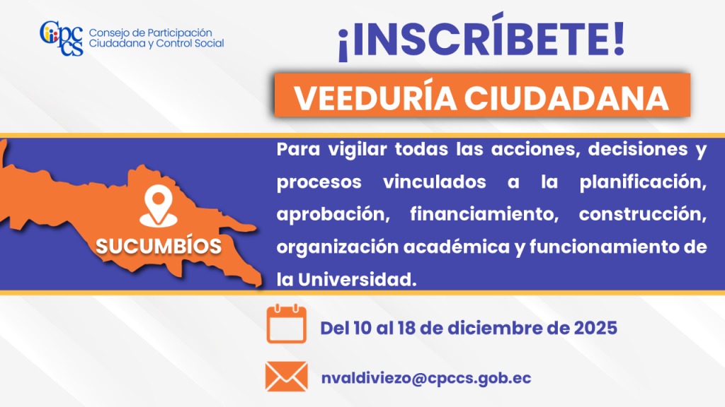Quito, 10 de diciembre de 2025 Boletín de Prensa Nro. 1131 Veeduría Ciudadana para vigilar la construcción del asfaltado, alcantarillado pluvial y obras complementarias en la calle 9 del cantón Tosagua El Consejo de Participación Ciudadana y Control Social (CPCCS) invita a la ciudadanía a inscribirse en la a Veeduría Ciudadana para vigilar la ejecución […]