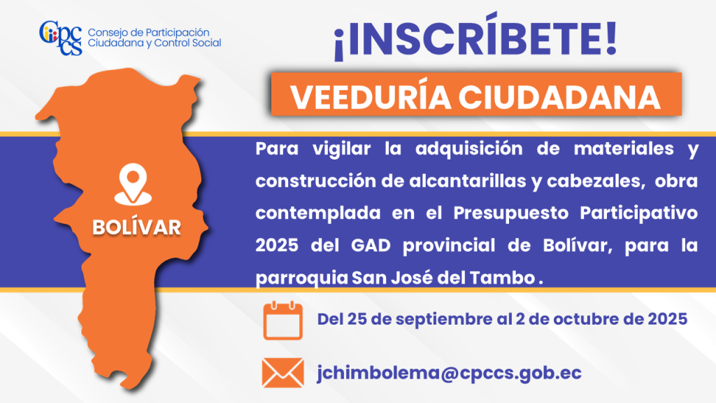 Quito, 24 de septiembre de 2025 Boletín de Prensa Nro. 1061 Veeduría para vigilar la adquisición de materiales y la construcción de alcantarillas en Bolívar El Consejo de Participación Ciudadana y Control Social (CPCCS) invita a la ciudadanía a inscribirse en la Veeduría para vigilar la adquisición de materiales para la construcción de alcantarillas y [...]