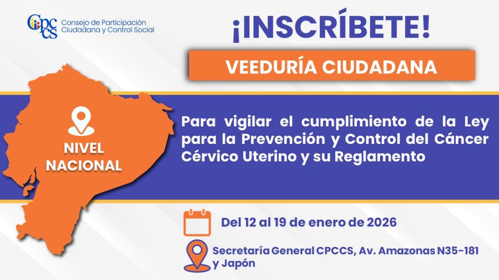 Quito, 12 de enero de 2026 Boletín de Prensa Nro. 1163 Veeduría Ciudadana para vigilar el cumplimiento de la Ley para la Prevención y Control del Cáncer Cérvico Uterino y su Reglamento El Consejo de Participación Ciudadana y Control Social (CPCCS) invita a la ciudadanía a inscribirse en la Veeduría Ciudadana para vigilar el cumplimiento, […]