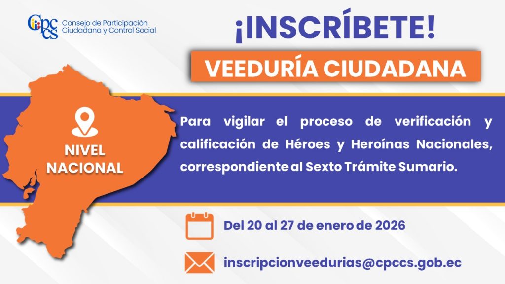 Quito, 20 de enero de 2026 Boletín de Prensa Nro. 1168 Veeduría para vigilar el proceso de calificación de Héroes y Heroínas Nacionales El Consejo de Participación Ciudadana y Control Social (CPCCS) invita a la ciudadanía a inscribir en la Veeduría Ciudadana para “vigilar el proceso de verificación y calificación de Héroes y Heroínas Nacionales, [...]