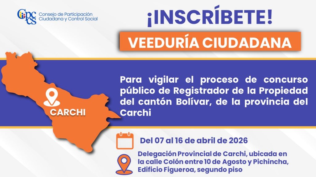 Quito, 06 de abril de 2026 Boletín de Prensa Nro. 1254 Segunda convocatoria a Veeduría Ciudadana para vigilar el proceso de concurso público de Registrador de la Propiedad del cantón Bolívar, de la provincia del Carchi El Consejo de Participación Ciudadana y Control Social (CPCCS) invita a la ciudadanía a inscribirse en la Veeduría Ciudadana […]