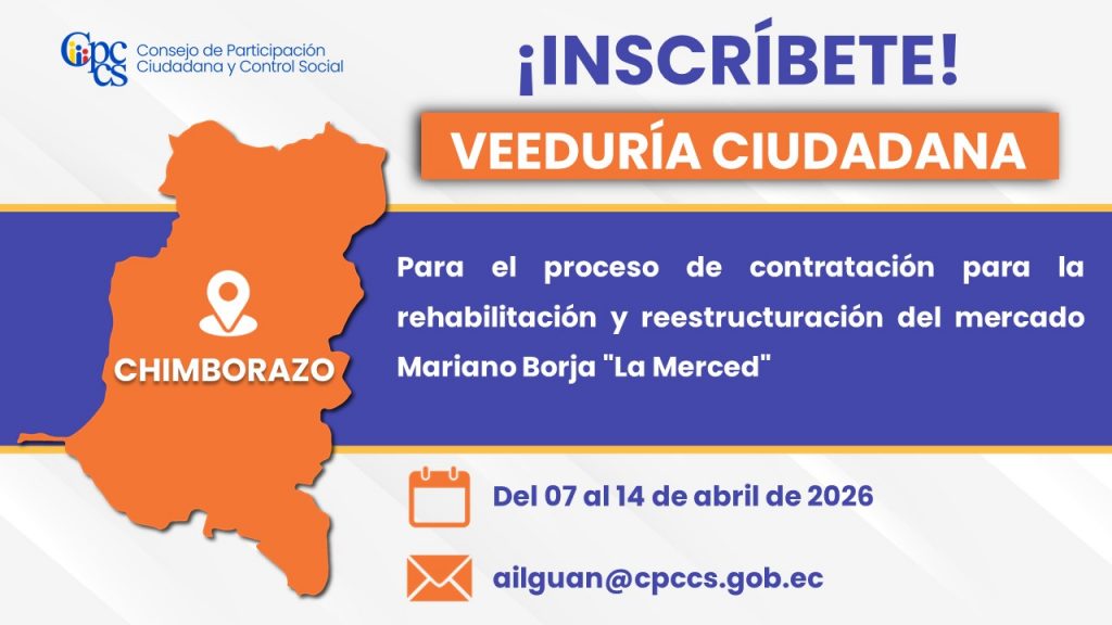 Quito, 06 de abril de 2026 Boletín de Prensa Nro. 1255 Segunda Convocatoria a Veeduría Ciudadana para el proceso de contratación para la rehabilitación y reestructuración del mercado Mariano Borja “La Merced” El Consejo de Participación Ciudadana y Control Social (CPCCS) invita a la ciudadanía a inscribirse en la Veeduría Ciudadana para vigilar la fase […]