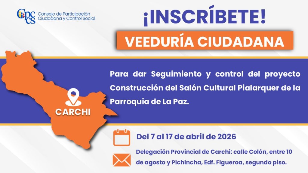 Quito, 06 de abril de 2026 Boletín de Prensa Nro. 1253 Veeduría Ciudadana para dar seguimiento y control del proyecto construcción del Salón Cultural Pialarquer de la parroquia de La Paz El Consejo de Participación Ciudadana y Control Social (CPCCS) invita a la ciudadanía a inscribirse en la Veeduría Ciudadana para dar seguimiento y control […]