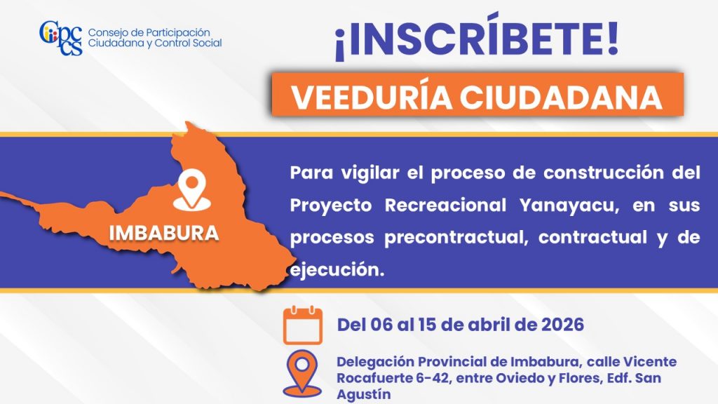 Quito, 06 de abril de 2026 Boletín de Prensa Nro. 1252 Veeduría Ciudadana para vigilar el proceso de construcción “Proyecto Recreacional Yanayacu” en sus procesos precontractual, contractual y de ejecución El Consejo de Participación Ciudadana y Control Social (CPCCS) invita a la ciudadanía a inscribirse en la Veeduría Ciudadana para vigilar el proceso de construcción […]