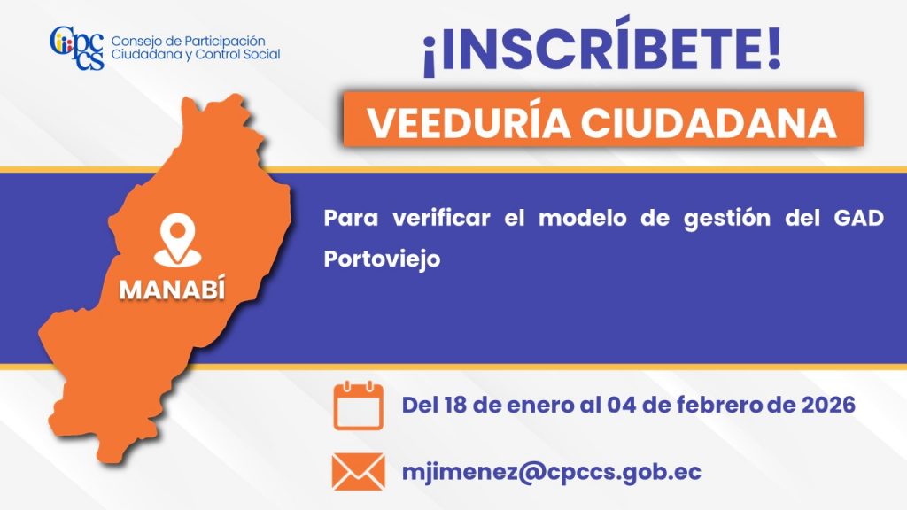Quito, 04 de febrero de 2026 Boletín de Prensa Nro. 1191 Veeduría Ciudadana para vigilar el proceso de verificación y calificación de Héroes y Heroínas nacionales, correspondiente al Sexto Trámite sumario El Consejo de Participación Ciudadana y Control Social (CPCCS) invita a la ciudadanía a inscribirse en la Veeduría Ciudadana para para vigilar el proceso […]