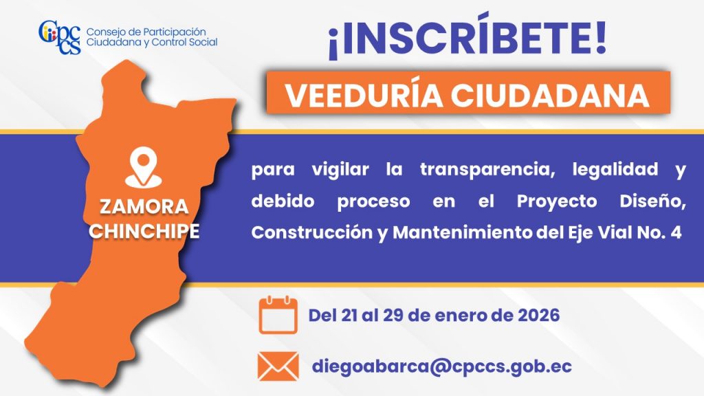 Quito, 26 de enero de 2026 Boletín de Prensa Nro. 1179 Se conforma la Veeduría Ciudadana para la designación del Registrador de la Propiedad del cantón Nangaritza El Consejo de Participación Ciudadana y Control Social (CPCCS) invita a la ciudadanía a inscribirse en la Veeduría Ciudadana para vigilar del concurso público del Registrador de la [...]